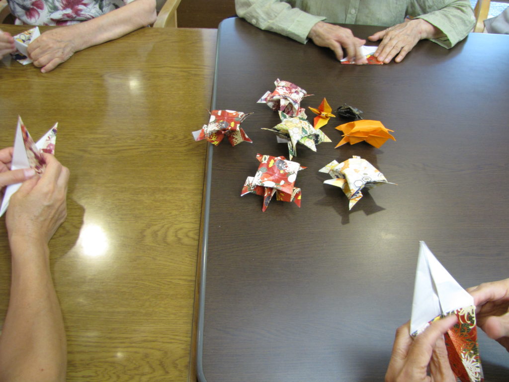 9月の折り紙は『鶴と亀』 【練馬KG】デイサービスのプログラム 出来上がり(^^♪「鶴、難しいね」と仰りながら折られてま…