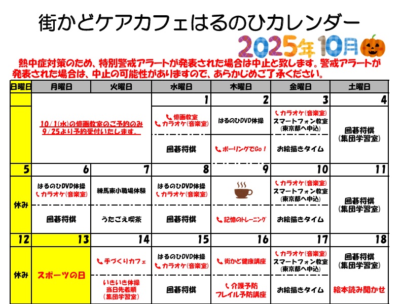 【街かどケアカフェ】10月 はるのひカレンダー 2025年10月分のケアカフェのカレンダーを発行いたしました&#x1f4…