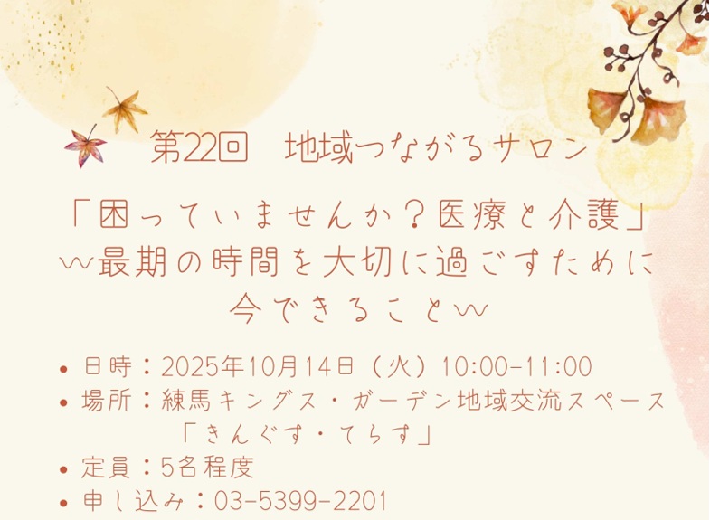 【練馬KG】10/14開催!地域つながるサロン 「困っていませんか?医療と介護」~最期の時間を大切に過ごすために今できる…