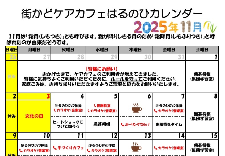 【街かどケアカフェ】11月 はるのひカレンダー 2025年11月分のケアカフェのカレンダーを発行いたしました&#x1f4…