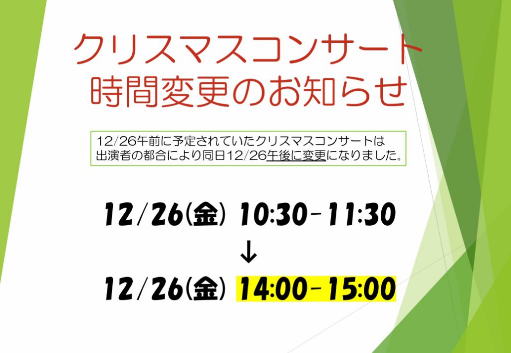 【街かどケアカフェ】12/26クリスマスコンサート時間変更のお知らせ 12/26午前に予定されていたクリスマスコンサート…