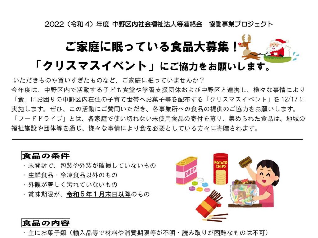 12/17開催予定、中野区クリスマスイベント(フードドライブ)への協力のお願い 「中野区社会福祉法人連絡会協働事業プロジ…