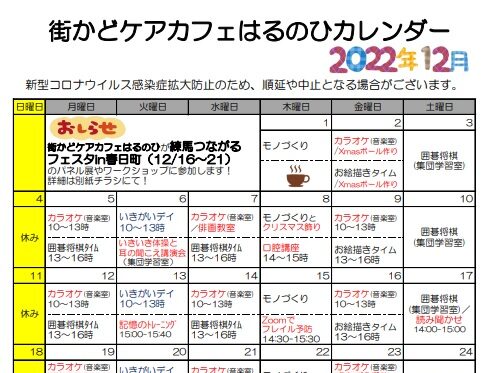 きんぐす便り&はるのひカレンダー(12月号) 北町はるのひ地域包括支援センター併設の街かどケアカフェはるのひの予定をカレ…