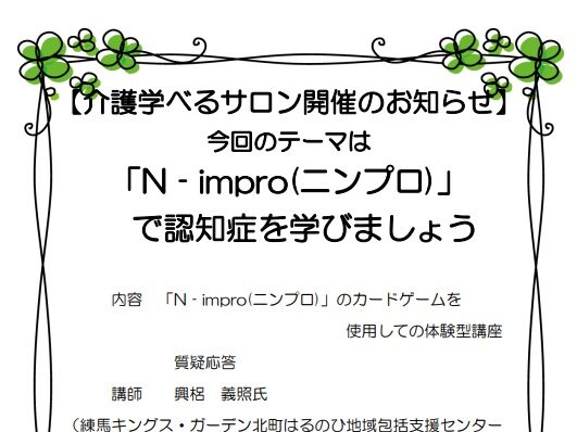 【練馬KG】2月の介護学べるサロンのお知らせ 今回のテーマは「N‐impro(ニンプロ)」 で認知症を学びましょう 内容…