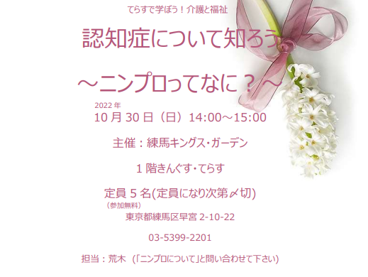 2022年10月30日(日)14:00~15:00 主催:練馬キングス・ガーデン1階きんぐす・てらす 定員5名(定員にな…