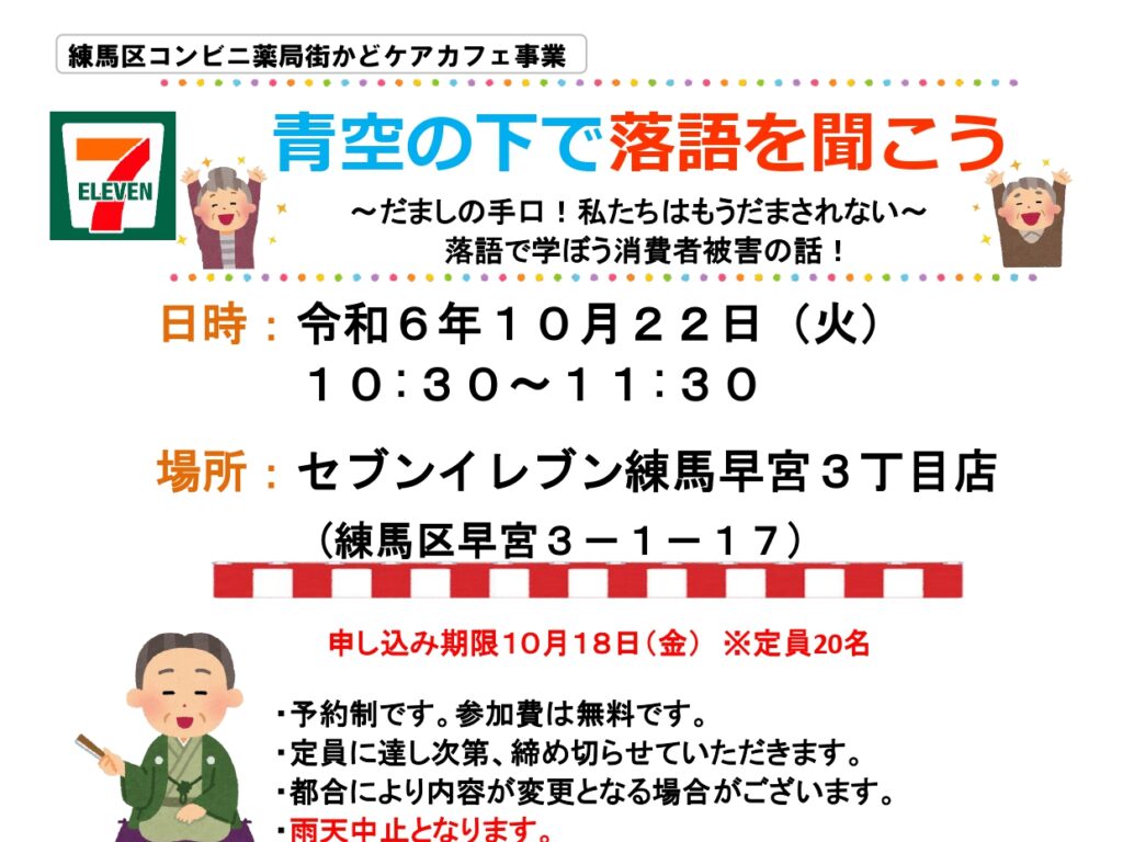【出張型まちかどケアカフェ】10/22開催!「青空の下で落語を聞こう」を開催いたします。詳細はチラシをご覧ください!みな…