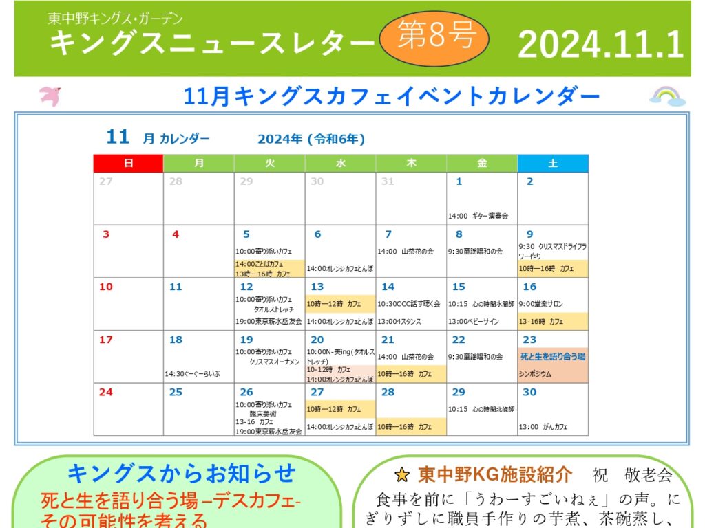 【東中野KG】キングスニュースレター11月号 こんにちは✨東中野キングス・ガーデンです。11月分のニュース…