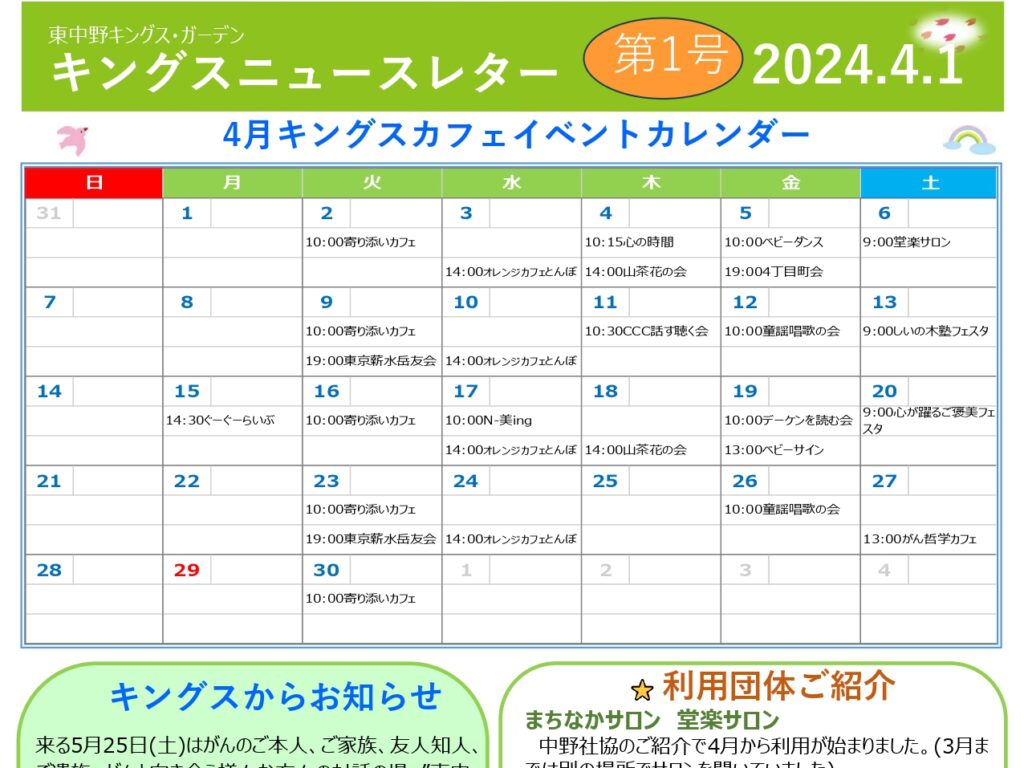 【東中野KG】キングスニュースレター4月号 こんにちは✨東中野キングス・ガーデンです。今年度より毎月ニュー…