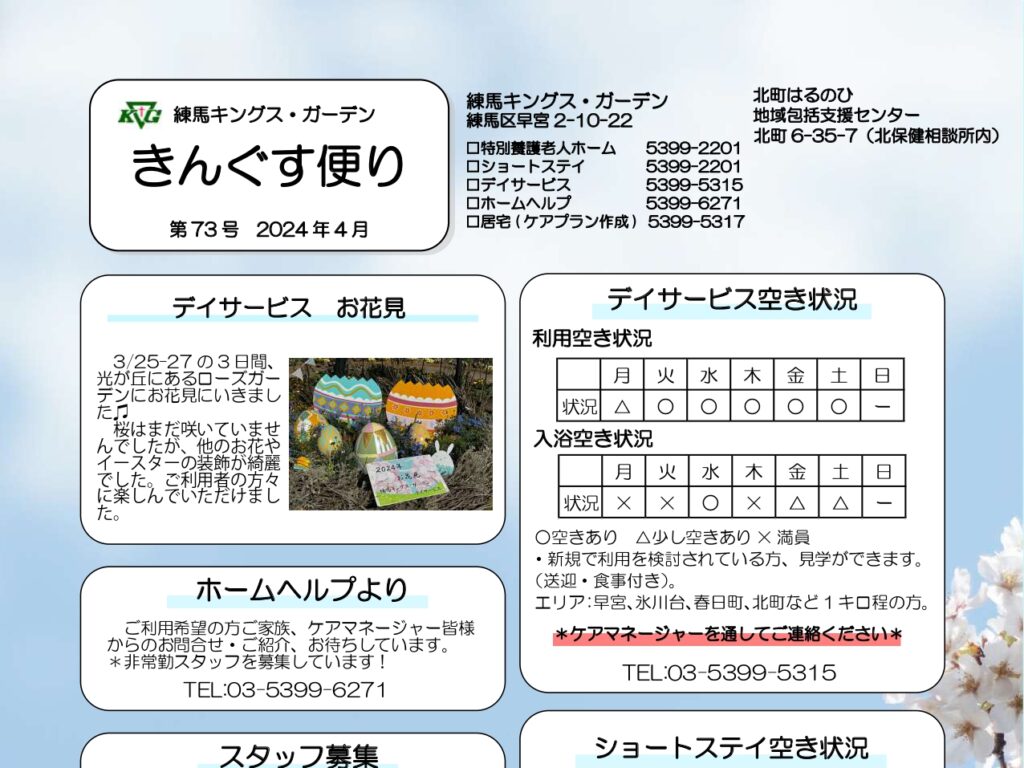 【練馬KG】きんぐす便り(4月号) 4月に入り、ようやく桜の見ごろを迎えお花見日和ですね🌸このたび4月号…