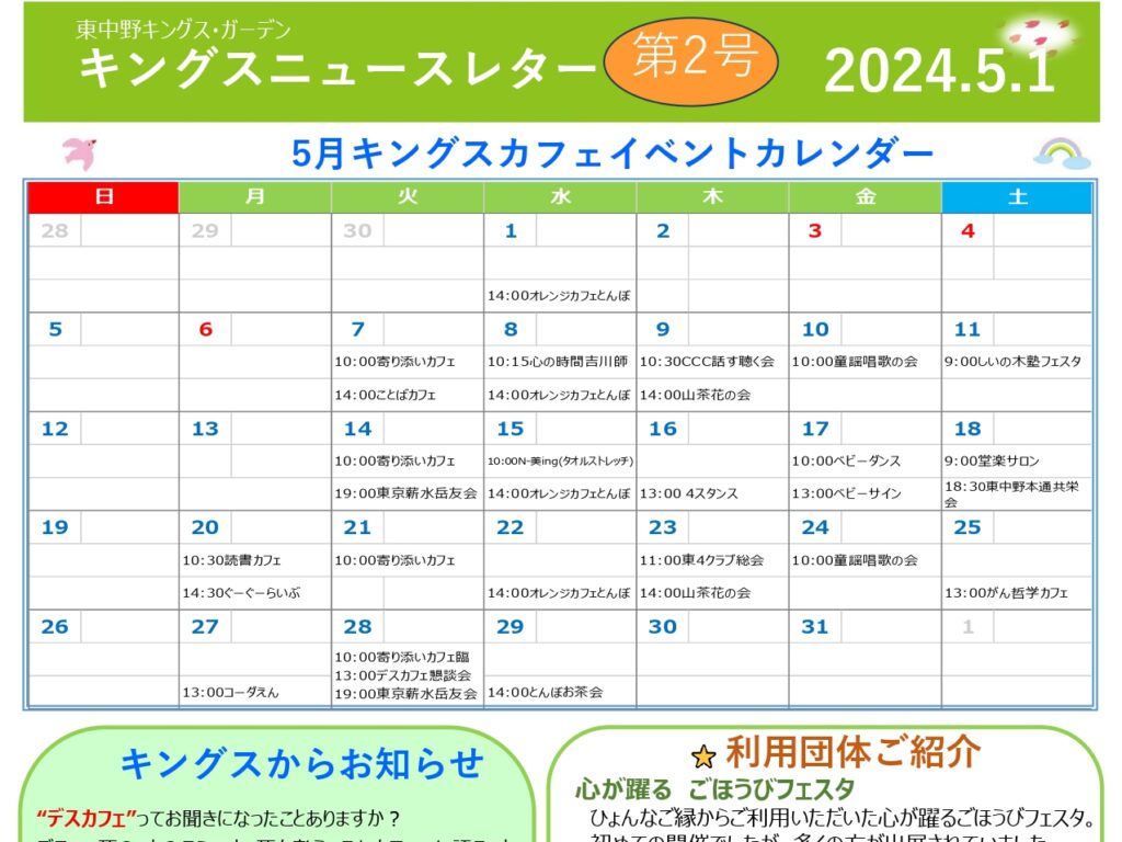 【東中野KG】キングスニュースレター5月号 こんにちは✨東中野キングス・ガーデンです。5月分のニュースレタ…
