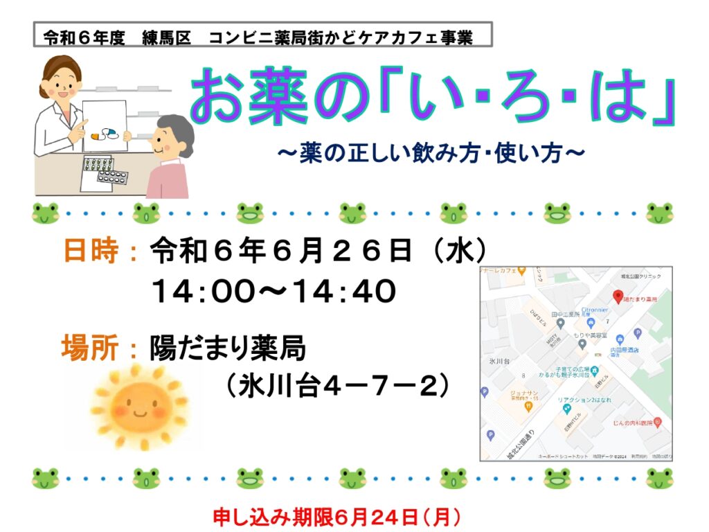 【出張型まちかどケアカフェ】6/26開催!お薬のいろは6/26(水)にお薬のいろはを開催いたします♩みなさまぜひご参加く…