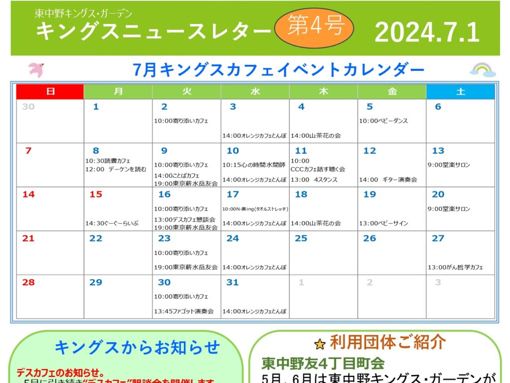 【東中野KG】キングスニュースレター7月号 こんにちは✨東中野キングス・ガーデンです。7月分のニュースレタ…
