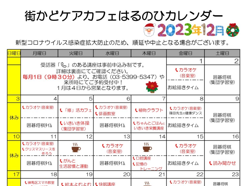 【街かどケアカフェ】12月 はるのひカレンダー 2023年12月分のケアカフェのカレンダーを発行いたしました。興味のある…