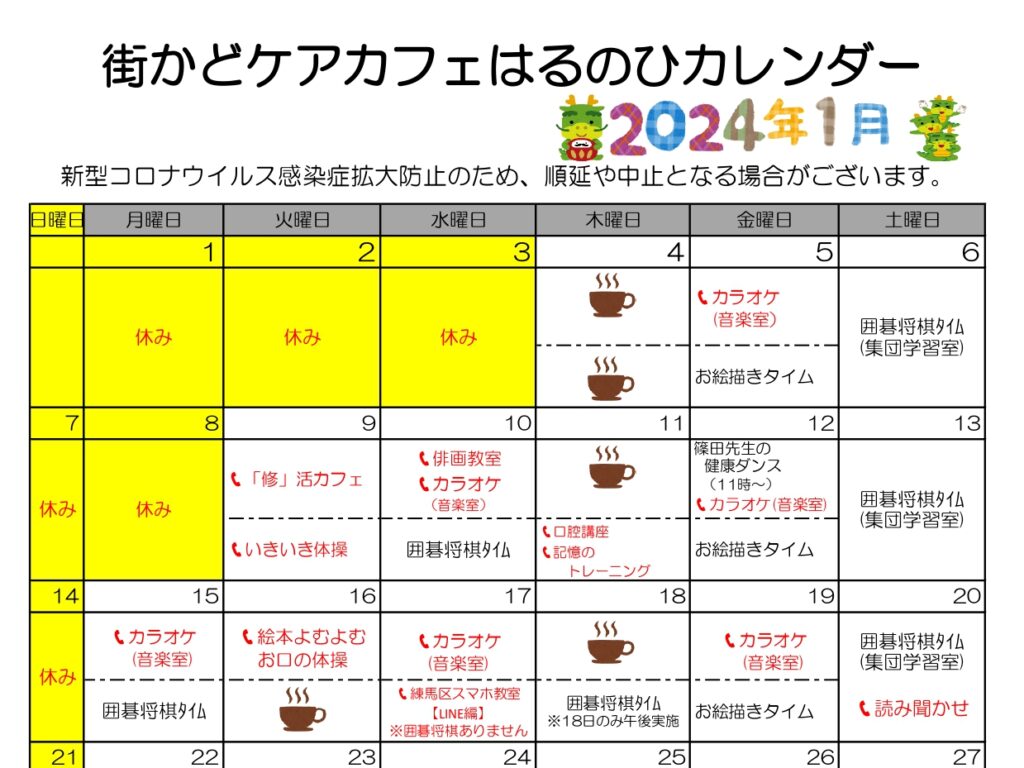 【街かどケアカフェ】1月 はるのひカレンダー 2024年1月分のケアカフェのカレンダーを発行いたしました。興味のあるカフ…