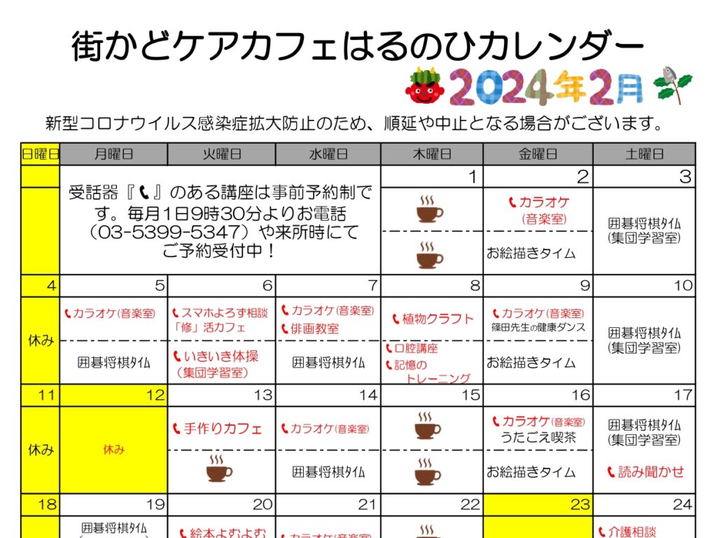 【街かどケアカフェ】2月 はるのひカレンダー 2024年2月分のケアカフェのカレンダーを発行いたしました。興味のあるカフ…