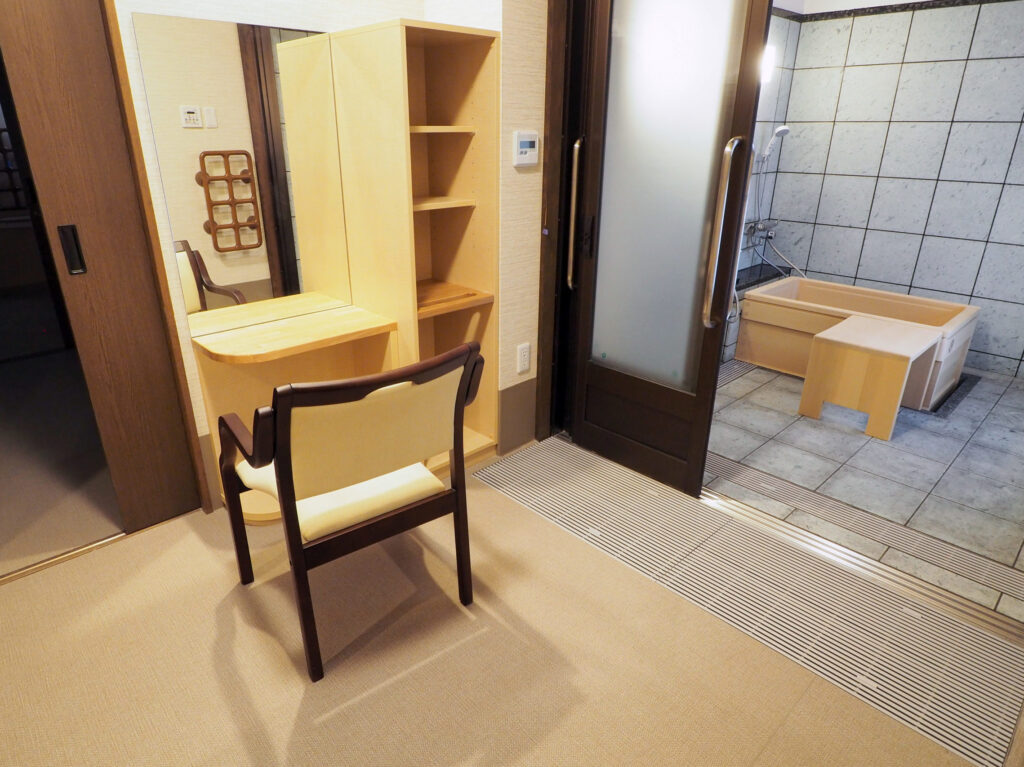 浴槽は「青森ひば」の木を使用。木のぬくもりと香りがただよいます。 介護度や障がいの程度に関係なく、誰もが入りたいと思っていただえるようなお風呂を目指し、機械をいっさい無くした浴室となっております。 おひとりずつ、ゆったり、お入りください。 職員がマンツーマンで対応いたします。