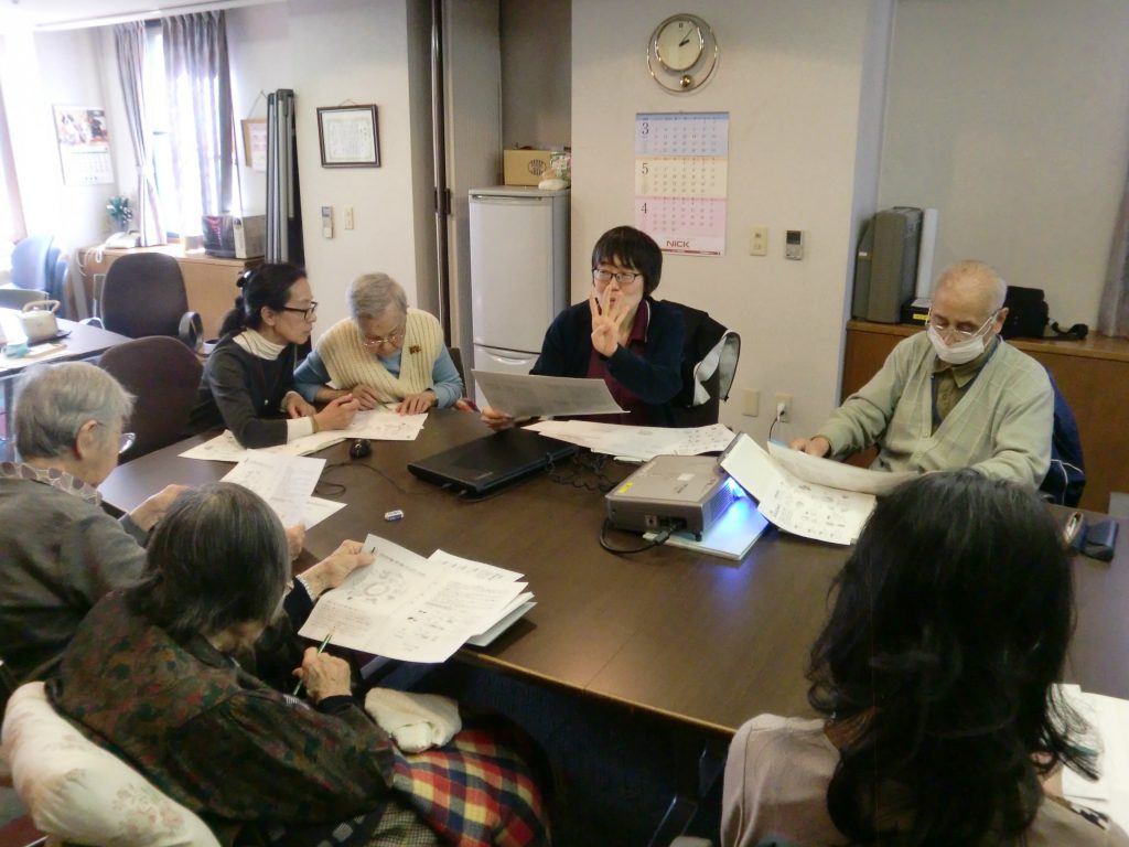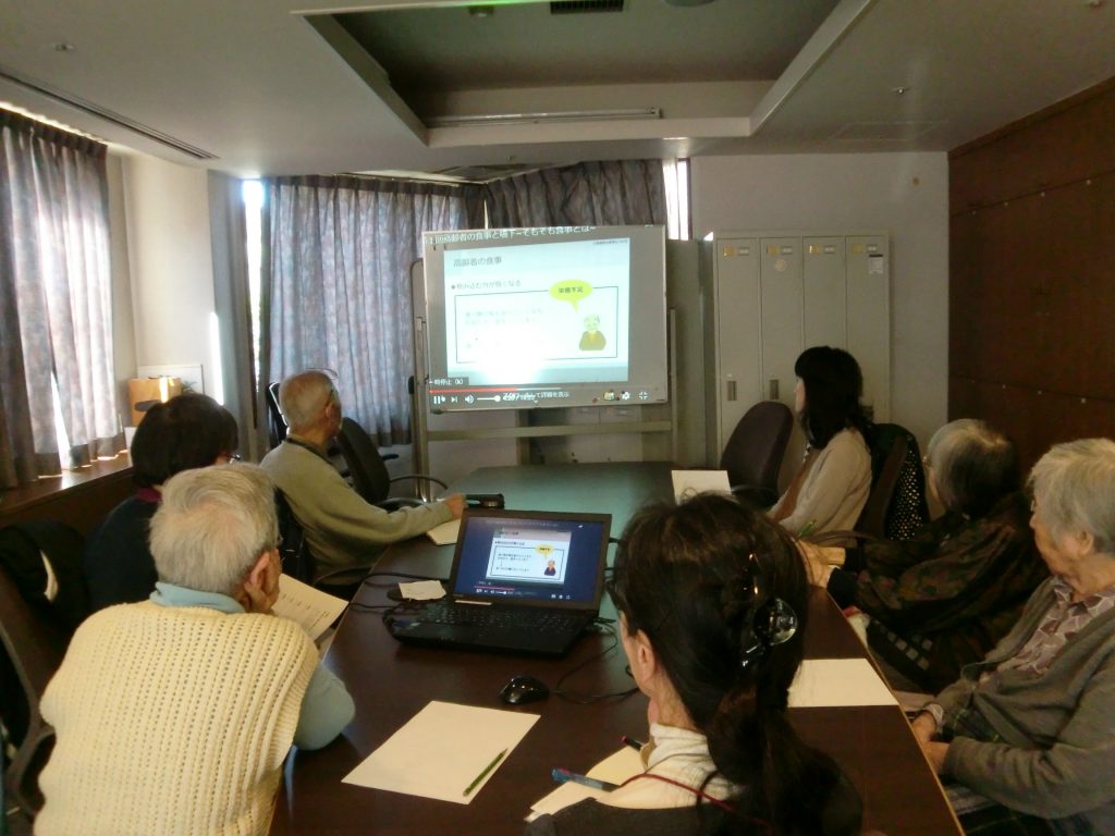 前半はプロジェクターによる上映会で、『高齢者の食事と嚥下』についてと『高齢者に足りない栄養』を見ながら、分量をかんたんに量る方法のプリントをお配りして説明を行いました。