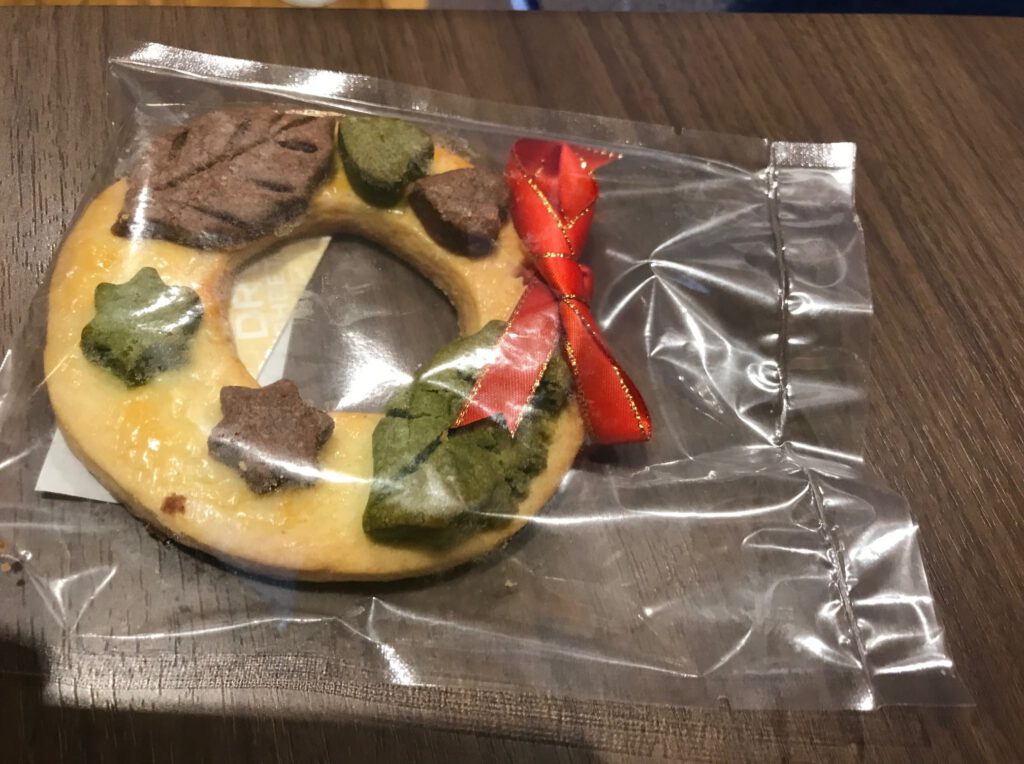 ご利用者が心を込めてスタンプしました「クリスマスカード」と東中野キングス謹製、割とボリューミーな「リースクッキー」。交流祭の時、差し上げていた「キングスオリジナルメモリアル缶バッジ」。