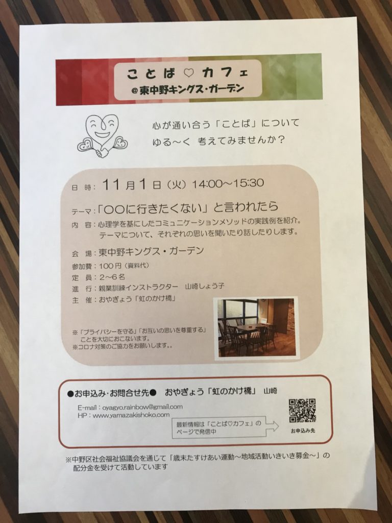 どちらも、丁寧な関係性、コミュニケーションの大切さと癒しの調べに委ねて自分の心の在り様を味わってみることの大切さを教えられます。ぜひご参加ください。奥山宛ご連絡いただければ。nakano.cafe@kg-tokyo.or.jp 03-3368-5200