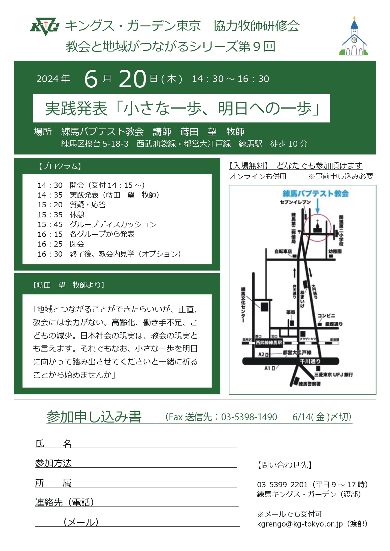 キングス・ガーデン東京では、協力牧師会の先生方等のご協力をいただきながら、2015年度から「教会と地域がつながるシリーズ」と銘打って、地域連携・貢献に係る研修会を開催してまいりましたが、この度第9回目を練馬バプテスト教会で開催することとなりました。