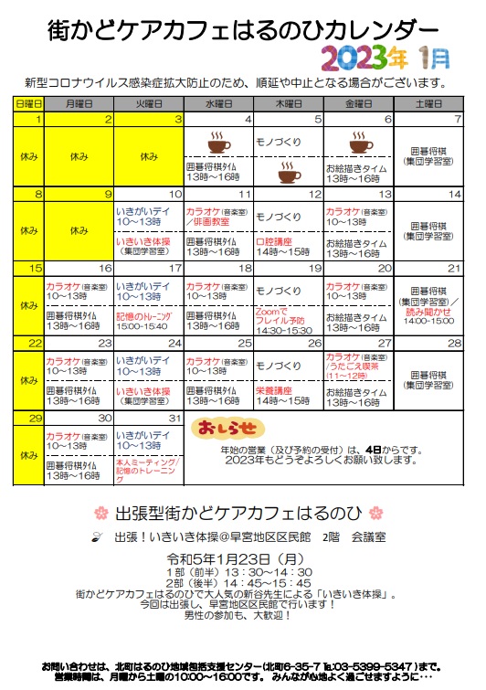 昨年度から北町6丁目に移転した地域包括支援センター併設の街かどケアカフェの情報発信「はるのひカレンダー」を合わせて発行しています。