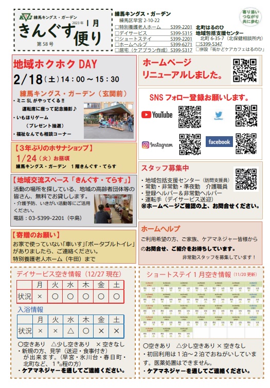 練馬キングス・ガーデンでは、月に一度、地域の皆さま、ケアマネジャー等関係機関向けに、情報発信のためのニュースレター「きんぐす便り」を発行しています。