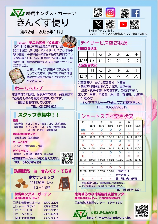 【練馬KG】きんぐす便り11月号 10月 30, 2025 By kgtokyo 【練馬KG】きんぐす便り11月号 こんにちは✨このたびきんぐす便り11月号を発行しました👀求人情報、各サービスの空き情報をぜひご活用ください!