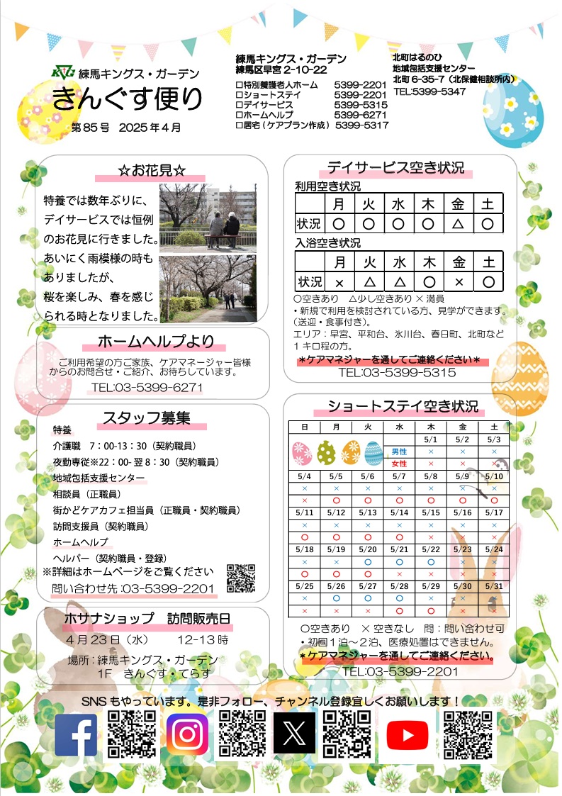【練馬KG】きんぐす便り4月号 4月 11, 2025 By kgtokyo 【練馬KG】きんぐす便り4月号 こんにちは✨このたびきんぐす便り4月号を発行しました👀求人情報、各サービスの空き情報をぜひご活用ください!