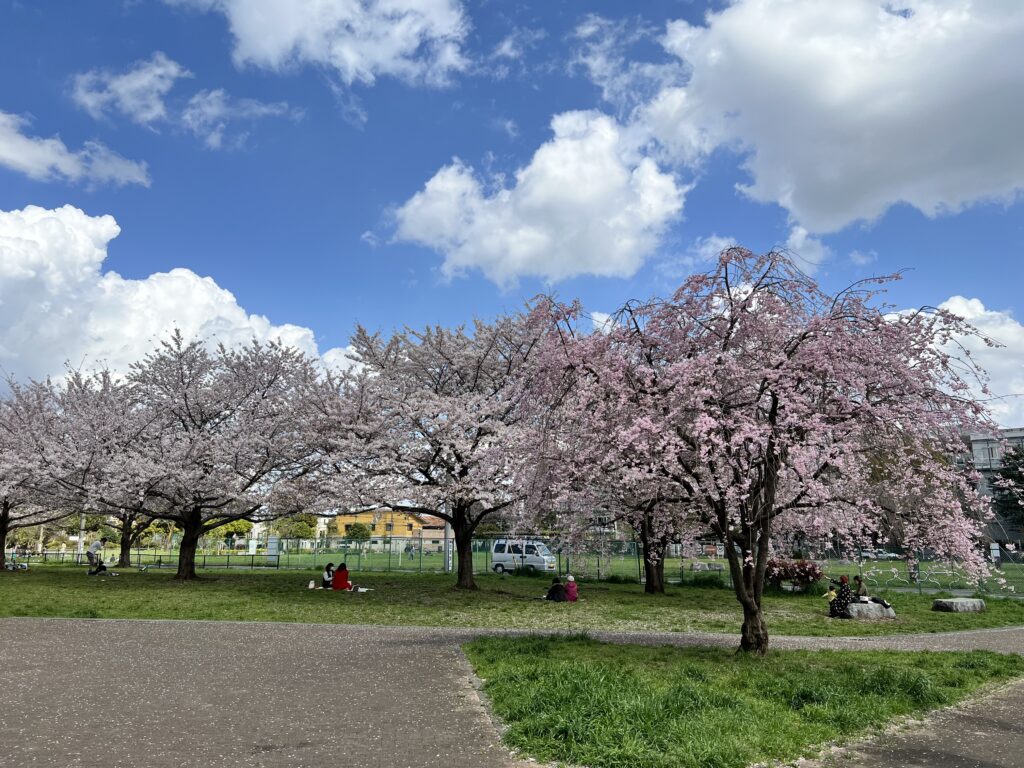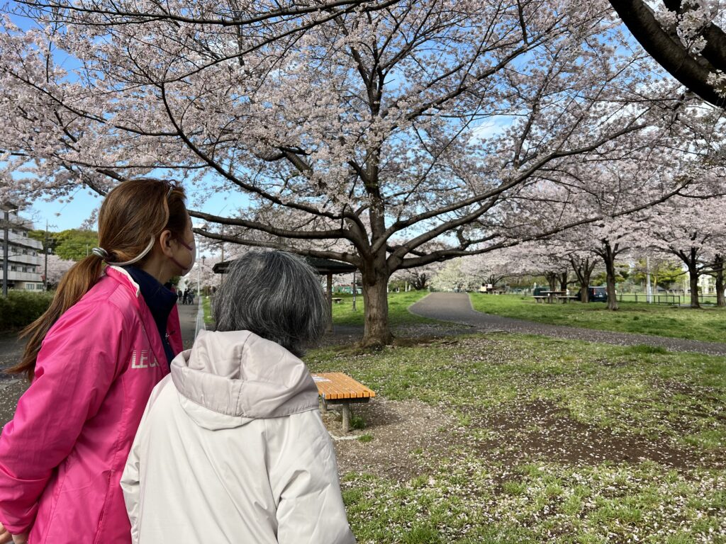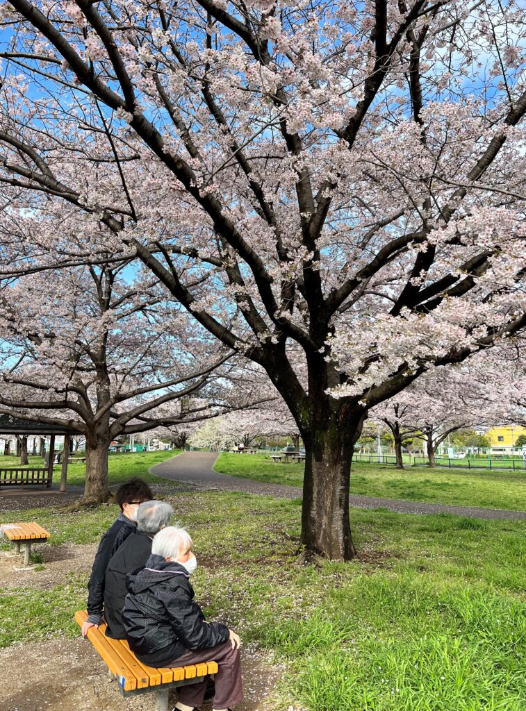 桜は満開で丁度見ごろを迎えており、「こんなに桜をきれいだと思ったことない。」とお話される方もおられました。1、2日目は曇り空や雨模様でしたが、散策の時間は雨が降ることなくベンチに座ってお話しながら、桜を愛でる事が出来ました。3日目は晴れて青空ときれいな桜を見ることが出来ました。行き帰りの道では、日替わりで石神井川沿いや春日町、光が丘、石神井公園などドライブしながらお花見し、車内でも歓声が上がっていました。