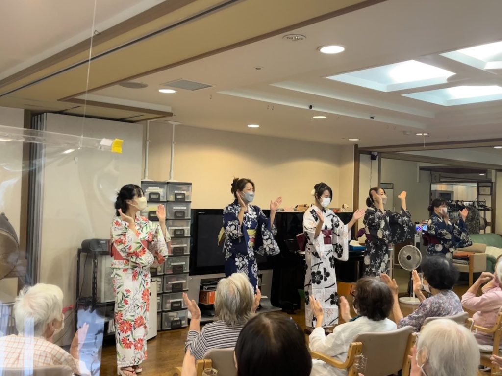 デイサービスのプログラムで盆踊りを開催しました。職員が浴衣を着て踊りました。