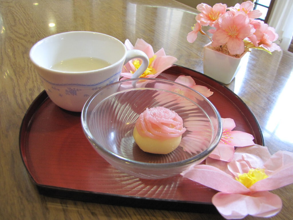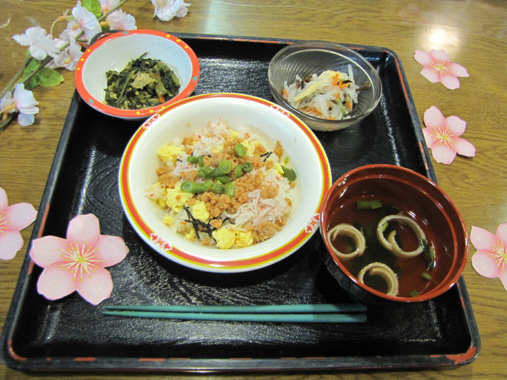 また、昼食は、鮭ちらし寿司、おやつは桜のイメージの練りきりと甘酒で「きれい」と皆様に好評でした。