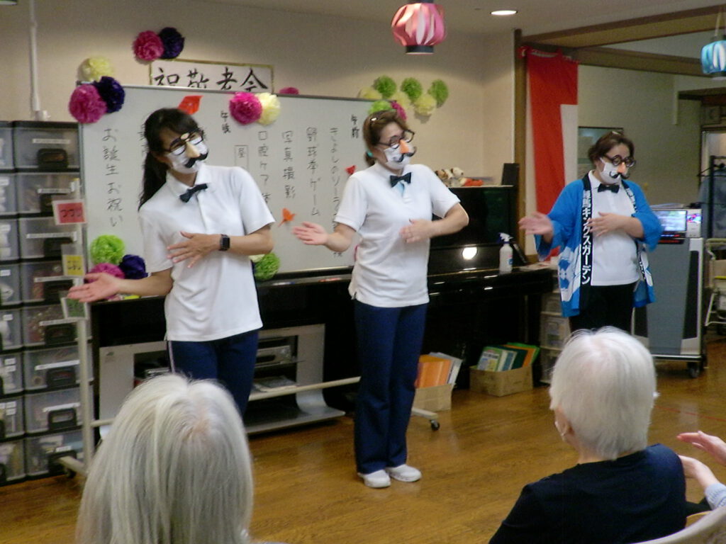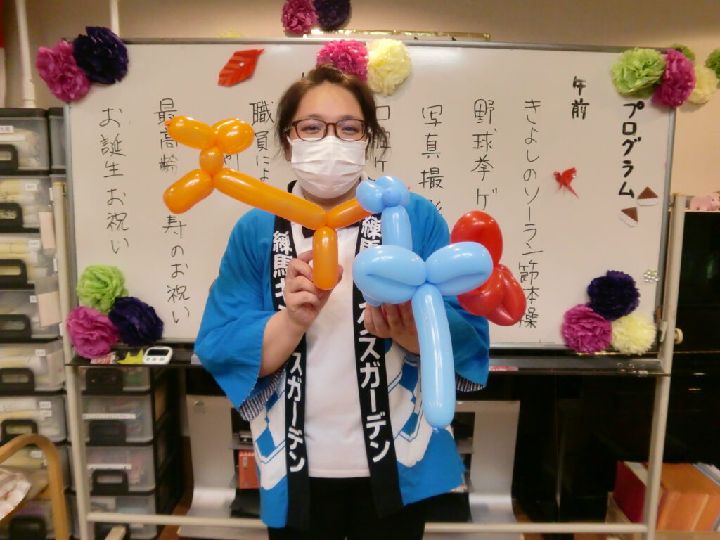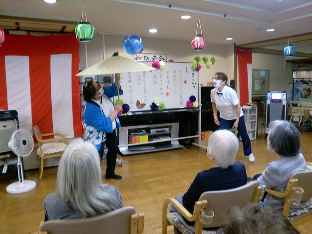 午後の初日は、職員による『お楽しみ会』バルーンアート、髭ダンス、傘回しなどを行いました。「たくさん笑わせてもらいました」「懐かしかった」と、お言葉を頂きました。