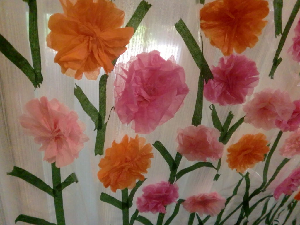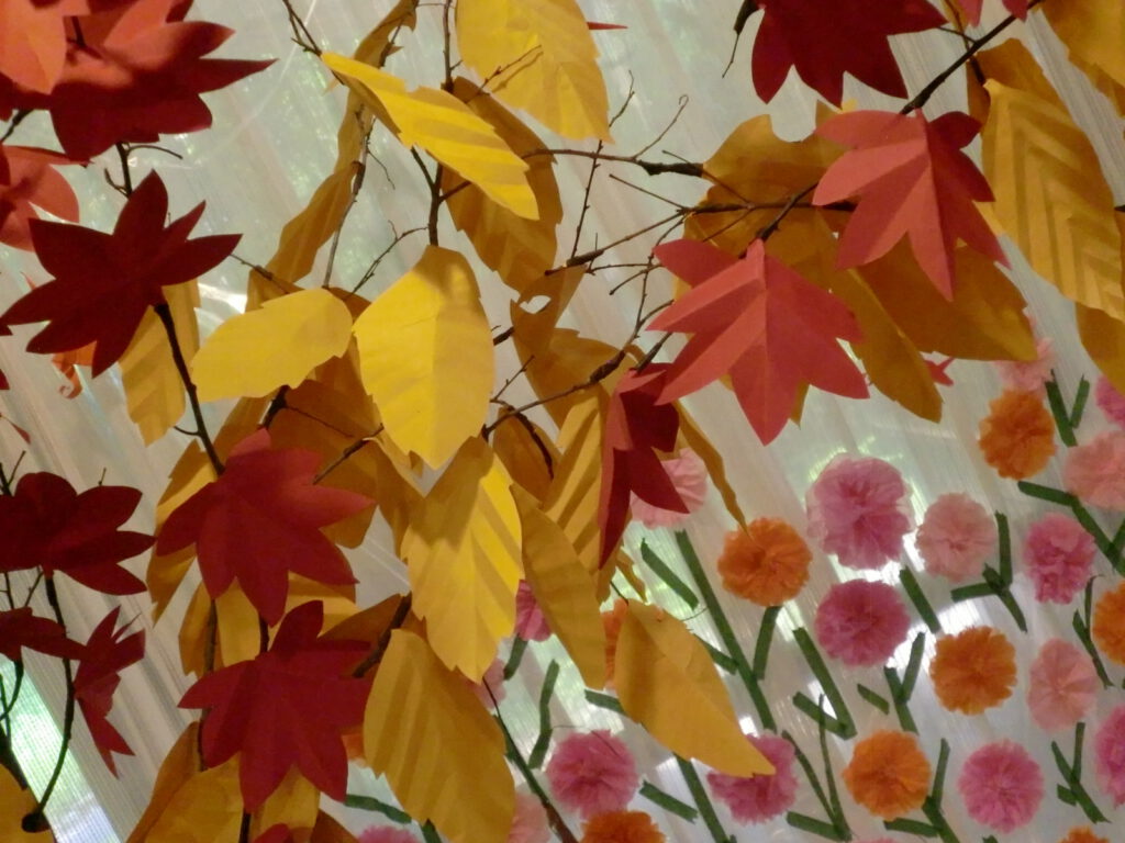 午前中は、きよしのソーラン節体操、野球拳ゲーム、写真撮影を行いました。写真スポットは利用者と職員と手作りし、飾りつけしました。コスモスはお花紙で作成、紅葉やいちょうの葉は色紙を切り抜き作成しました。「本物みたい」と、とても好評でした。