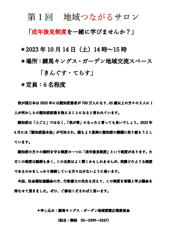 【練馬KG】第1回 地域つながるサロン「成年後見制度を一緒に学びませんか?」10月14日(土)開催