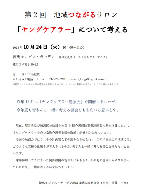 【練馬KG】第2回地域つながるサロン「ヤングケアラー」について考える。10/24(火)開催予定