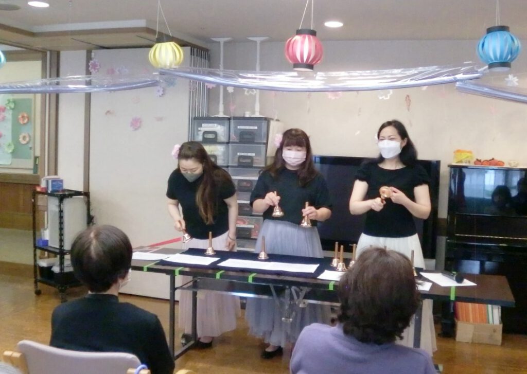 また、お花見コンサートとして、職員による箏の演奏、ハンドベルの演奏、歌、都はるみ体操、演芸、フラ、ベリーダンス等様々な演目を披露させて頂きました。