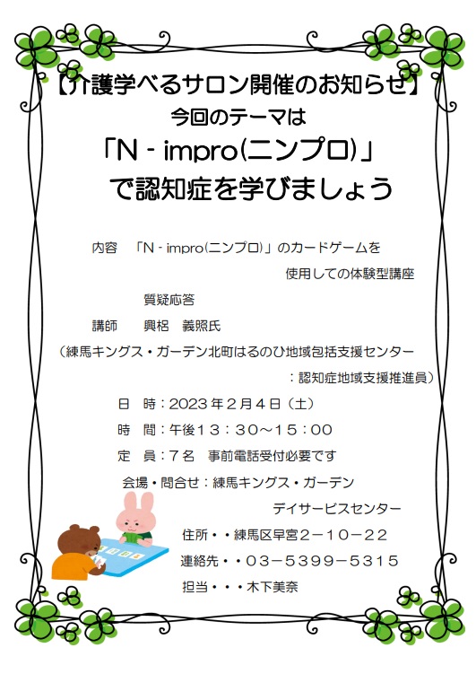 【練馬KG】2月の介護学べるサロンのお知らせ
