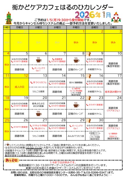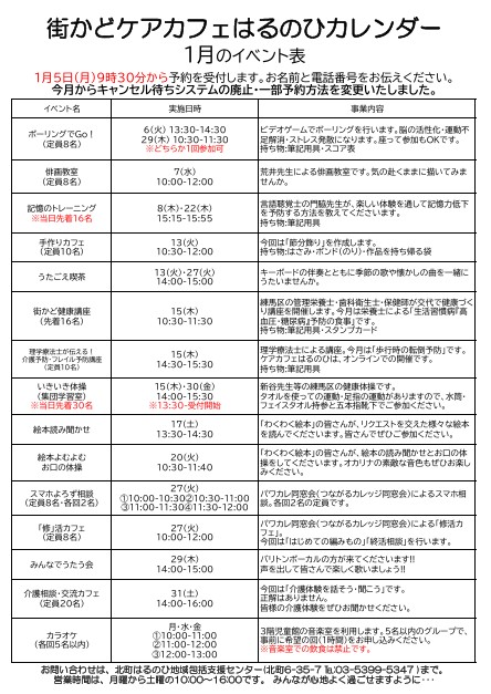 【街かどケアカフェ】1月 はるのひカレンダー