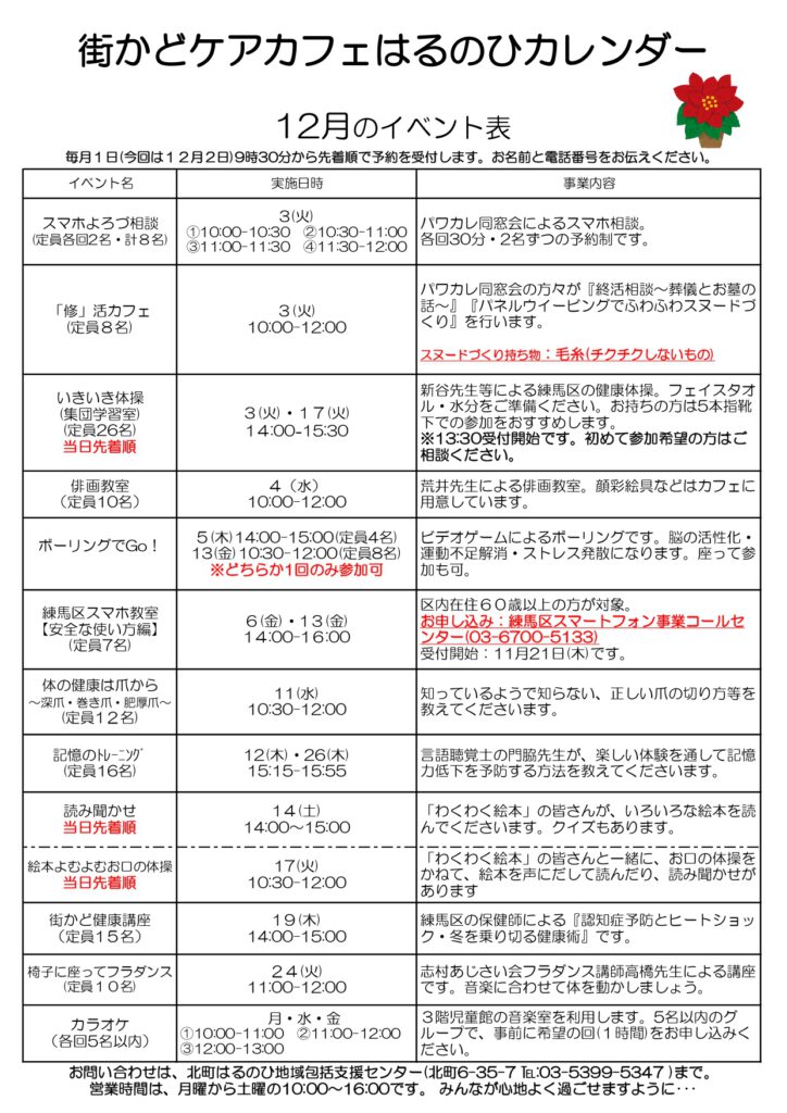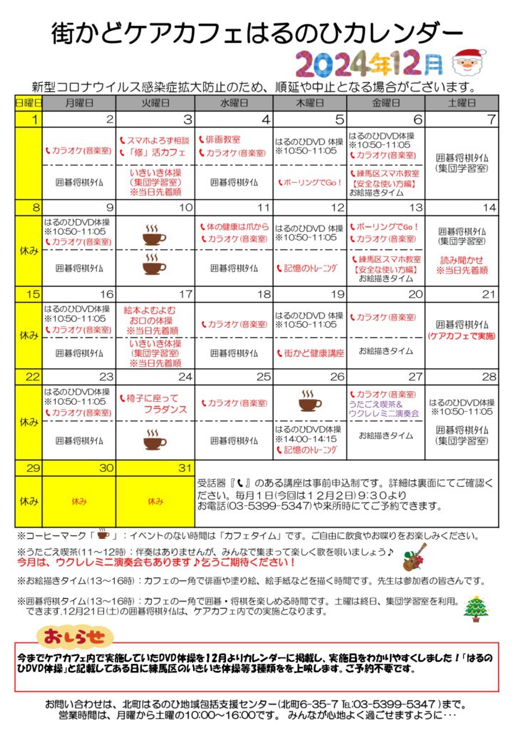 【街かどケアカフェ】12月 はるのひカレンダー