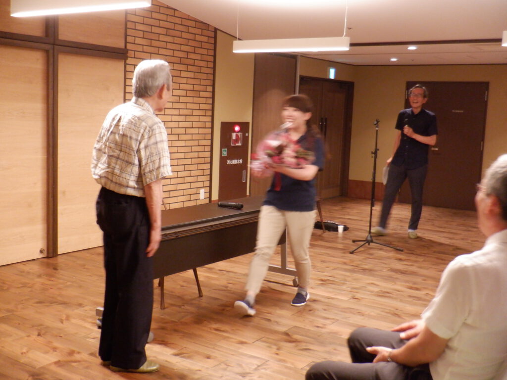 茶菓を囲んで懇親の時、新理事長を知る「クイズゲーム」で盛り上がり、最後は花束贈呈、祈り、記念撮影で締めくくりました。