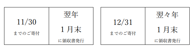 *これは領収書の領収日が当法人への着金日となっているためです。クレジットカードでご寄付の場合、ご寄付のお申し込みをいただいてから翌月20日にクレジットカード会社から当法人へ入金されるため、年末にいただき翌年に入金されたご寄付については領収書の発行が翌年の1月20日以降になります。